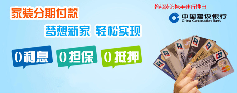 瀚邦装饰携手中国建设银行推出信用卡分期付款装修,开通专项装修额度,不影响正常刷卡消费,0担保、0抵押、0首付、0利息,真正实现花明天的钱圆今天的装修梦。